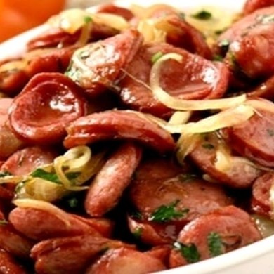 Calabresa Acebolada acompanhado de Arroz branco, Feijão e Duas Guarnições.