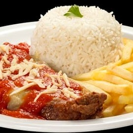 Bife Contra Filé Empanado com Molho Tomate, Queijo e Orégano, Arroz branco, Feijão e Fritas