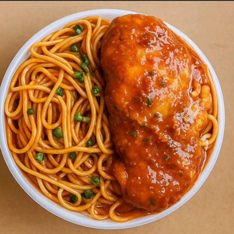 Delicioso Espaguete ao molho de tomates com Parmegiana de Frango e Queijo.