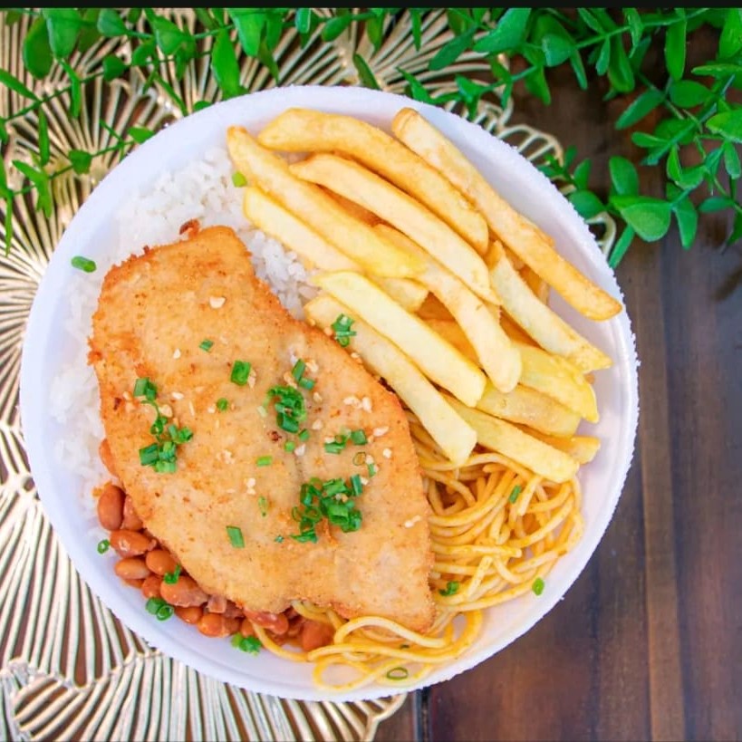 Filé Frango á Milanesa acompanhado de Arroz branco, Feijão com Caldo, Duas Guarnições e Salada do Dia.