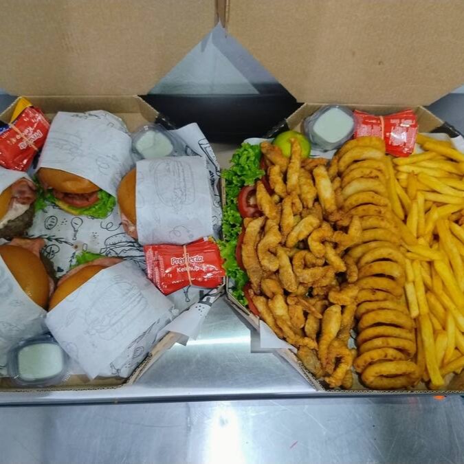 Acompanha 4 lanches gourmet (1 burguer, 1 bacon, 1 x salada, 1 bacon salada) acompanhado de