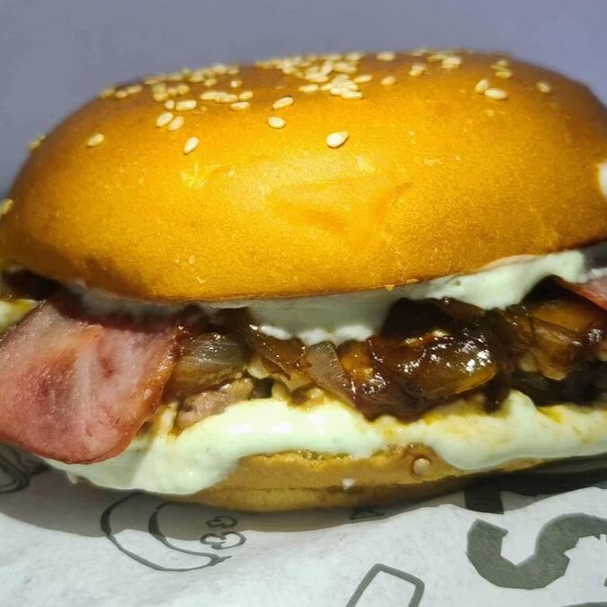 Pão Brioche Macio, 3 Carnes Smash 100g, Queijo Cheddar Fatiado, Cebola Caramelizada e Maionese Verde da Casa
