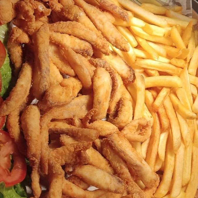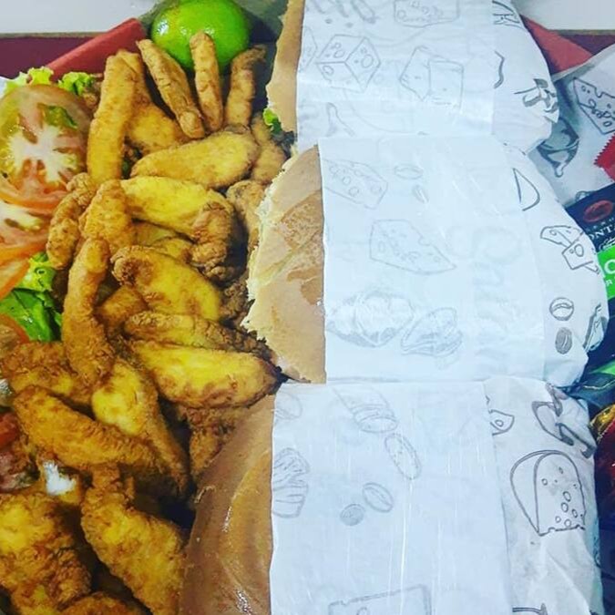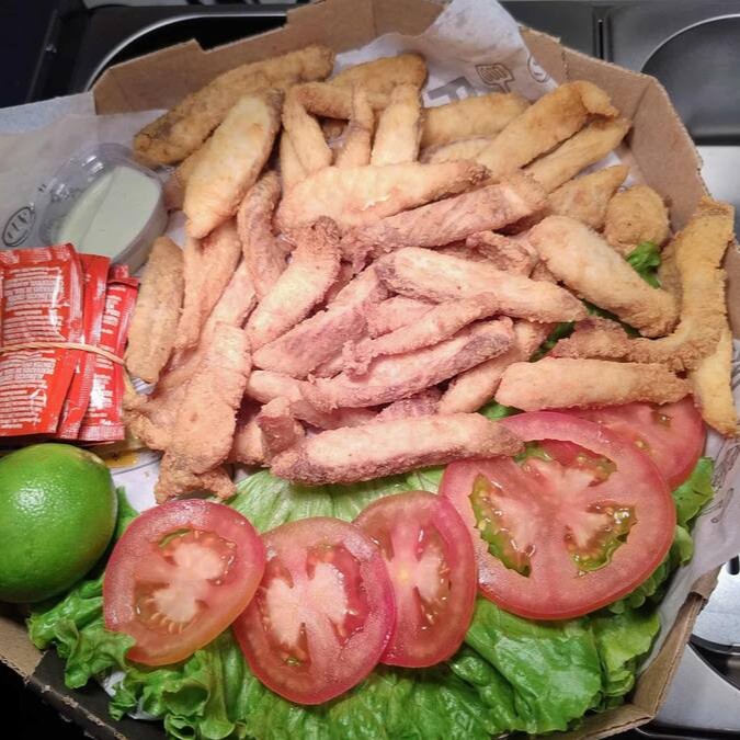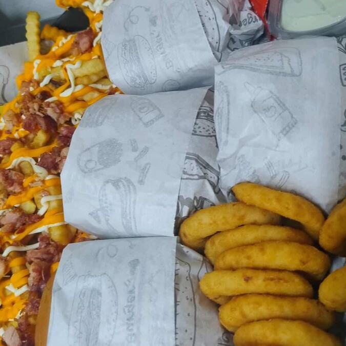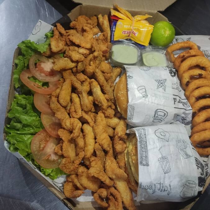 Acompanha 2 bacon salada gourmet (pão brioche macio, carne artesanal 100g, cream chese, bacon, alface e tomate) acompanhado de iscas de tilapia 500g ,