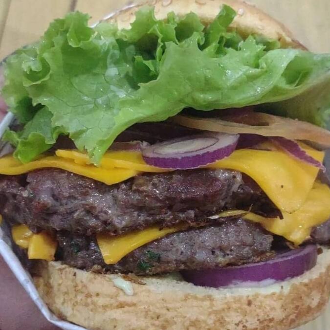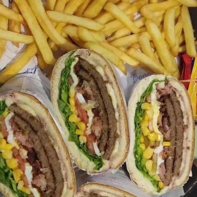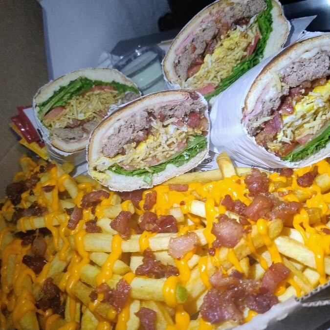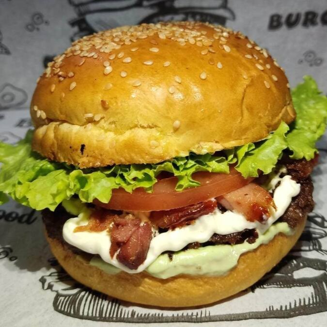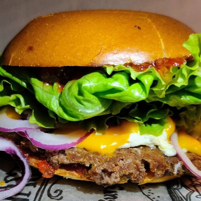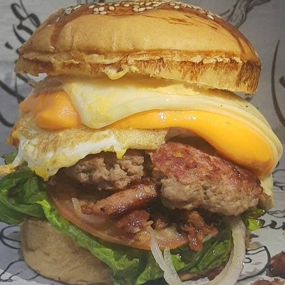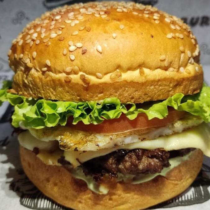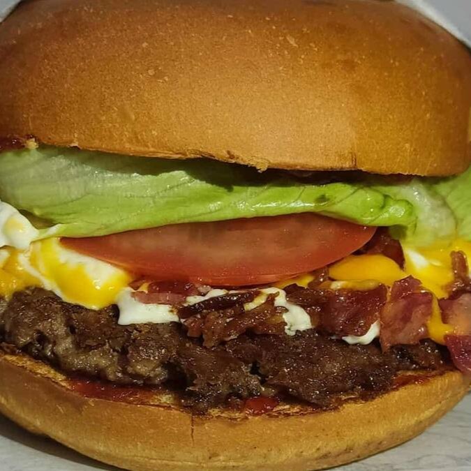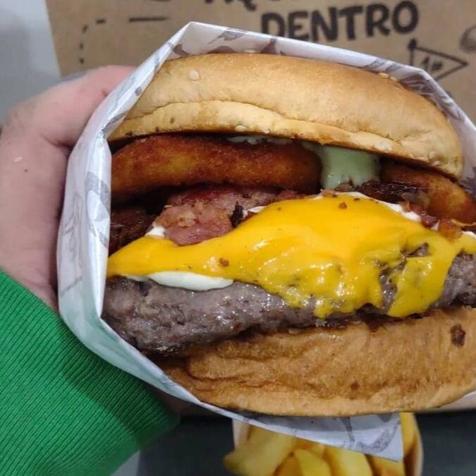 Pão Brioche Macio , Suculento Burguer 160g , Bacon em Tiras , Ovo , Cheddar Fatiado , Alface , Tomate , Cebola Roxa e Maionese Verde da Casa. Acompanha 100g de Batata Frita