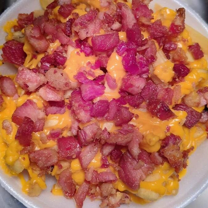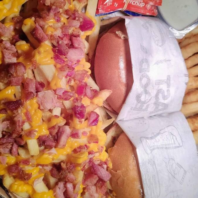 Acompanha 3 bacon salada gourmet (pão brioche macio, carne artesanal 100g, cream chese, bacon, alface e tomate) acompanhado de batata frita com cheddar cremoso e bacon crocante,