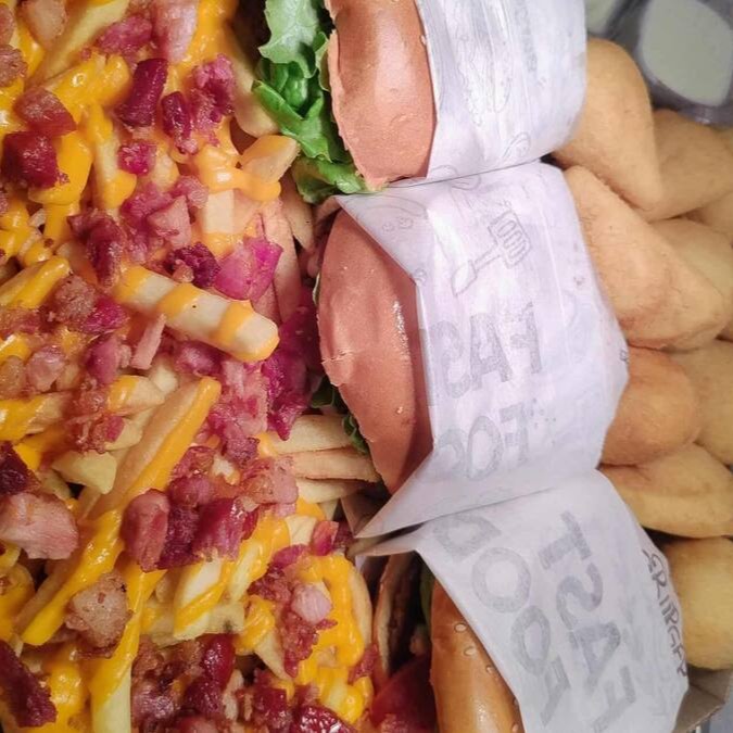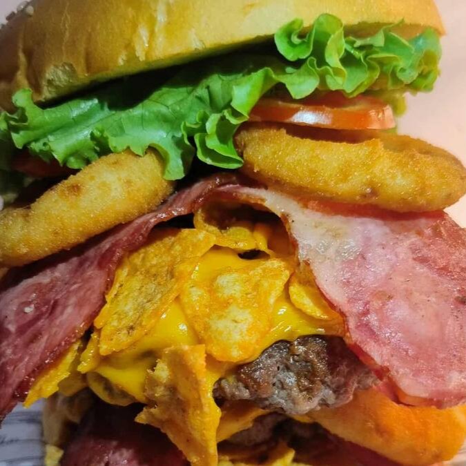 Pão Brioche Macio, Suculento Burguer 160g , Queijo Cheddar Fatiado, Bacon em Fatias , Doritos , Alface , Tomate e Maionese Verde da Casa + 100g de batata frita