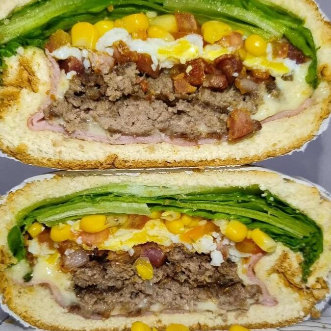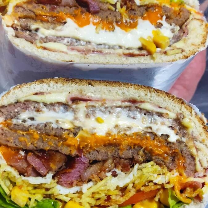 Pão de Hamburguer, Hamburguer Artesanal Ovo Presunto Mussarela Alface Tomate Milho
