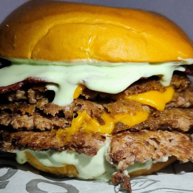 Pão Brioche Macio, 4 Carne Smash 100g, Queijo Cheddar Fatiado, Bacon em Tiras e Maionese Verde da Casa