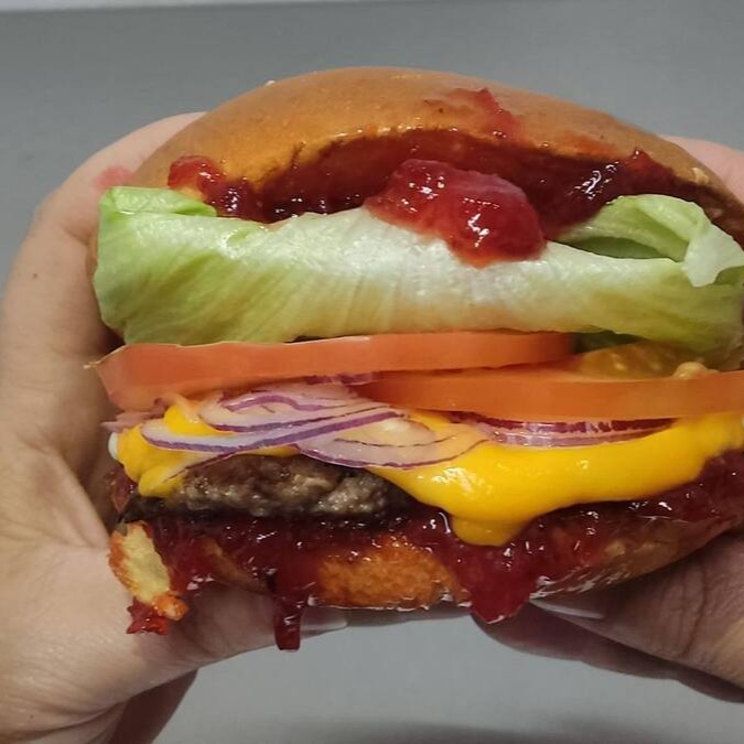 Pão Brioche Macio, Smash Burguer de 100g,Queijo Cheddar Fatiado, Alface, Tomate, Cebola Roxa e Geleia de Morango com Pimenta