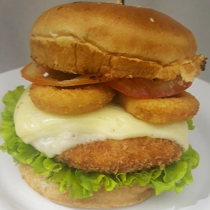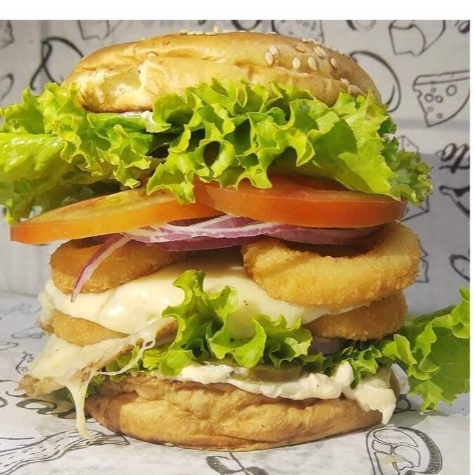 Pão Brioche Macio, Ovo , Mussarela , Cream Chesee, Alface , Tomate, Cebola Roxa , Anel de Cebola e Maionese Verde Caseira. Acompanha 100g de batata frita