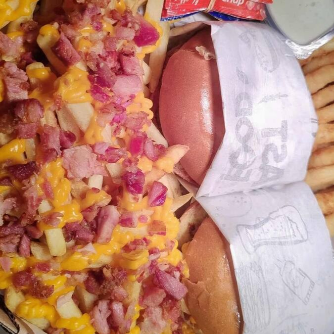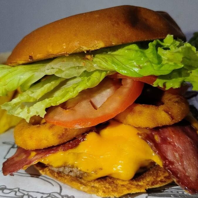 Pão Brioche Macio , Suculento Burguer 160g , Queijo Cheddar Fatiado , Bacon em Tiras , Batata Frita , Alface , Tomate Acompanha 100g de Batata Frita