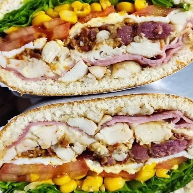 Filé de frango ovo bacon presunto mussarela alface tomate e milho