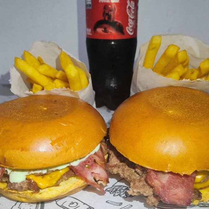 2 Smash Bacon (pão brioche macio, 2 carnes 80g, cheddar fatiado, bacon em tiras e maionese verde da casa) acompanhado de 2 batata frita(P) e 1 coca cola 600 geladinha