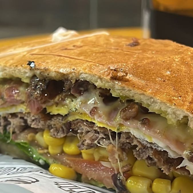 Sabor das antigas. Pão, ketchup, mostarda, alface, tomate, milho, ovo, bacon, burger 160g, muçarela e presunto.