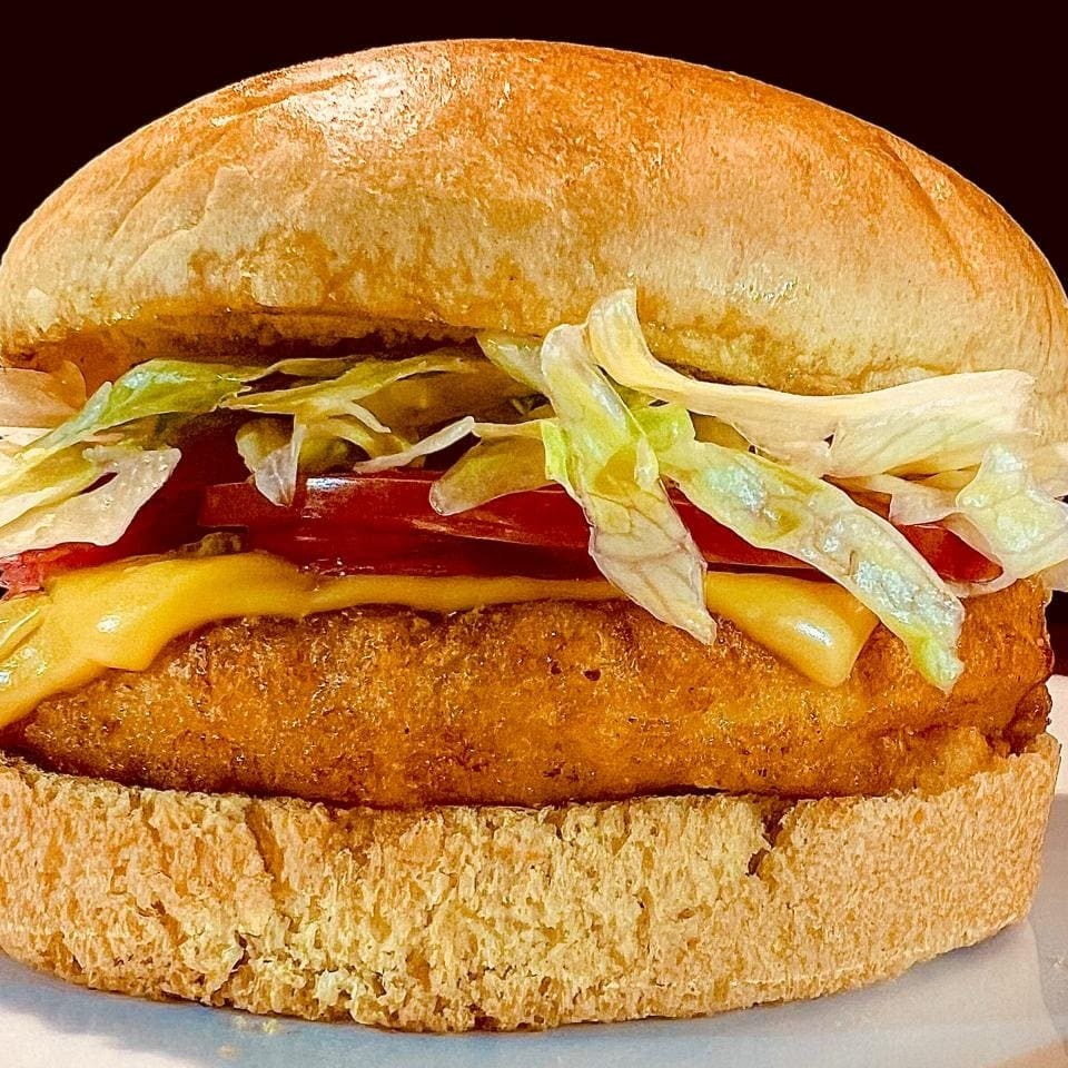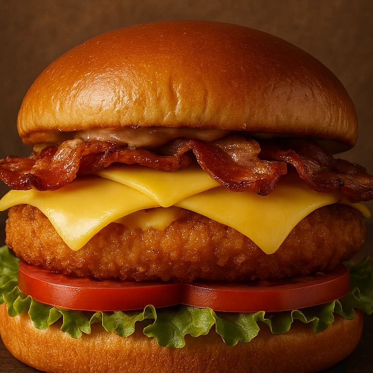 Pão brioche, hamburguer de frango empanado, queijo prato, bacon, tomate, alface e maionese defumada.