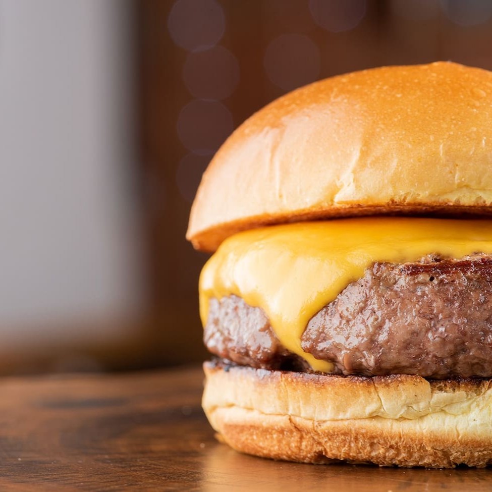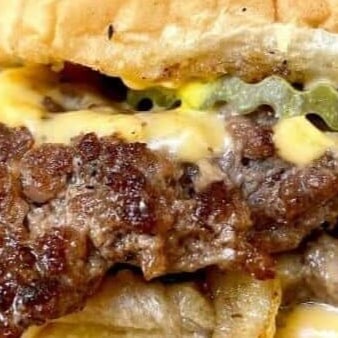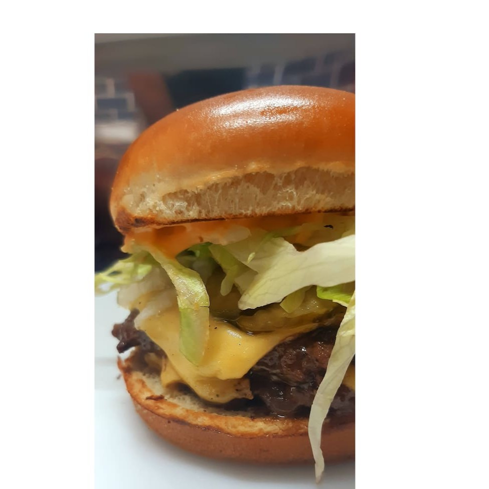 Pão brioche, 2 burgers de 80g cada prensados na chapa com cebola,queijo cheddar e picles.