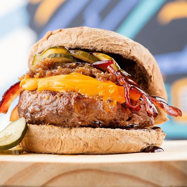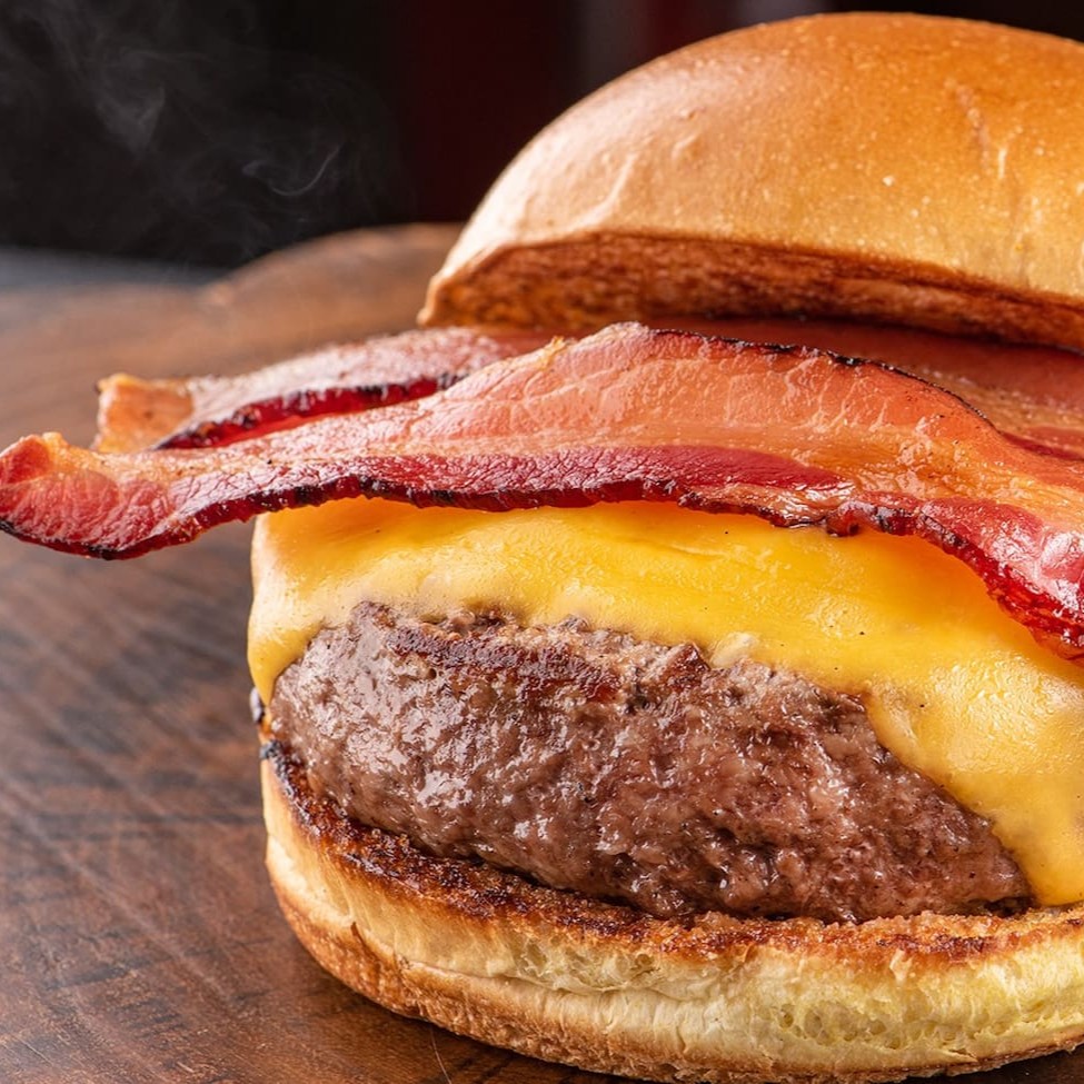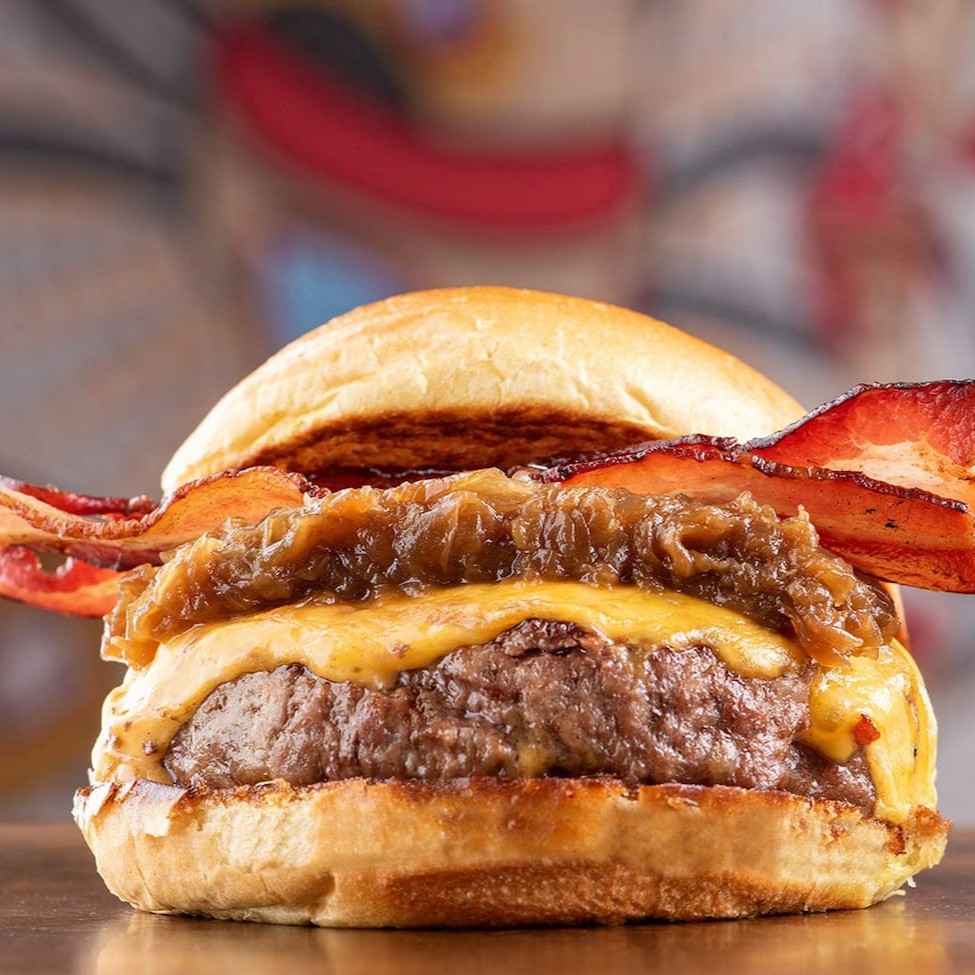 Pão brioche, bacon, burger 160g, cebola caramelizada, picles da casa e molho bbq. * foto ilustrativa no pão australiano