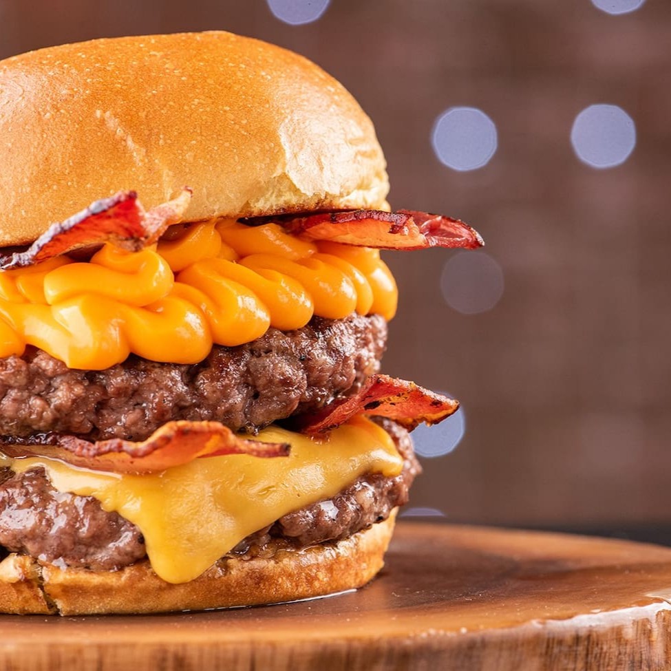 Pão brioche, 2 carnes de 160g cada, bacon, queijos prato e cheddar.