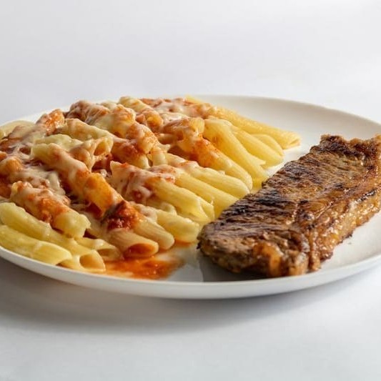 Penne ao sugo, suculento E contrafilé e mussarela bem derretida.