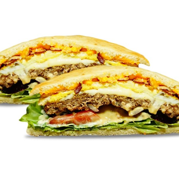 Pão Sírio, alface, maionese, tomate, cebola, molho especial, hambúrguer 200g, bacon, cheddar, ovo e mussarela