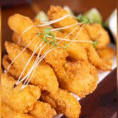 Tilápia empanada com arroz branco, feijão, fritas e salada