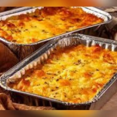 Escondidinho feito com creme de mandioca, molho branco, requeijão, costela, mussarela e batata palha.