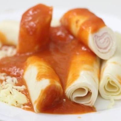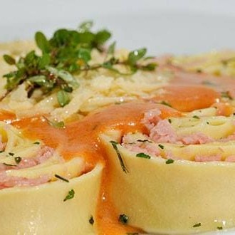 Massa de caneloni recheado com presunto e mussarela.