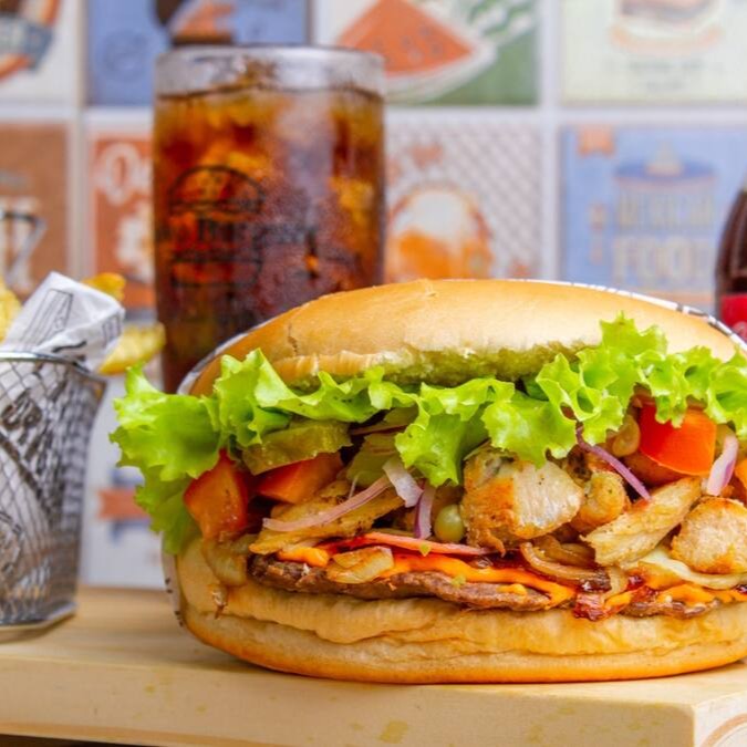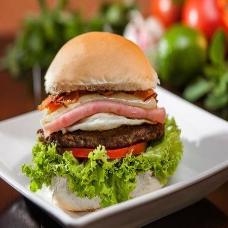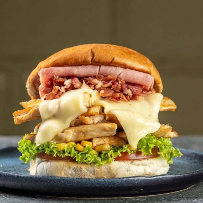 Hamburguer, bacon, presunto, mussarela, ovo, alface, tomate, milho, catchup e maionese