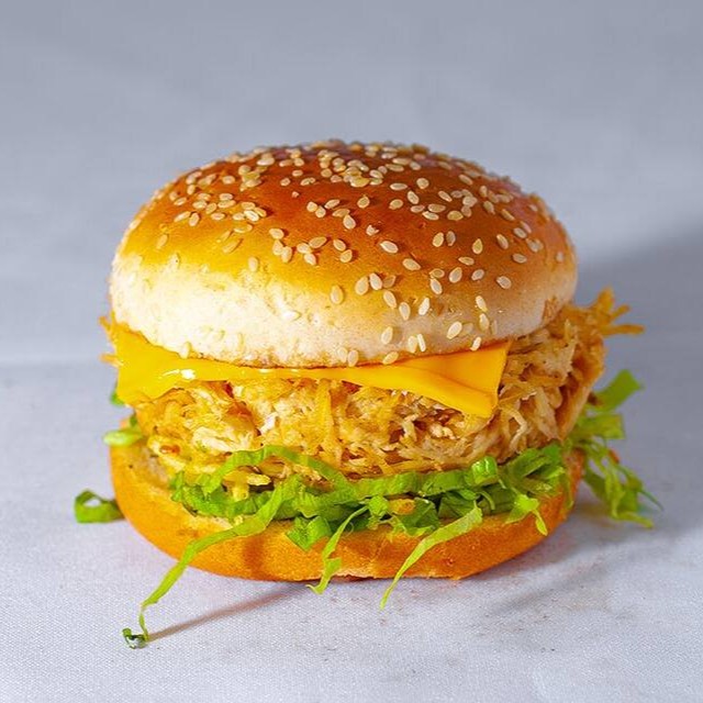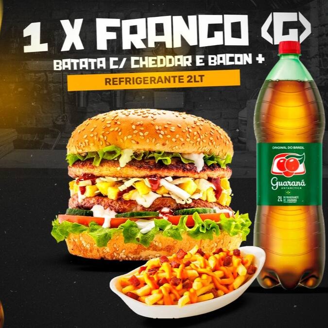 Filé de frango, bacon, ovo, presunto, mussarela, cheddar, batata palha, alface, tomate, milho, catchup e maionese