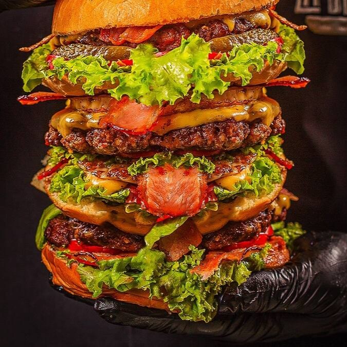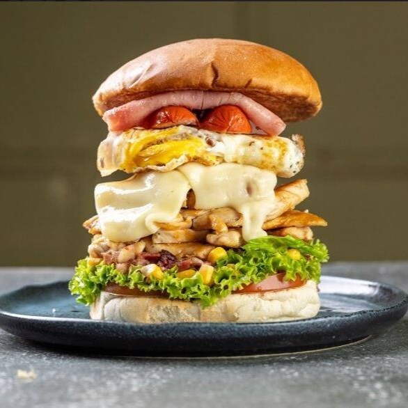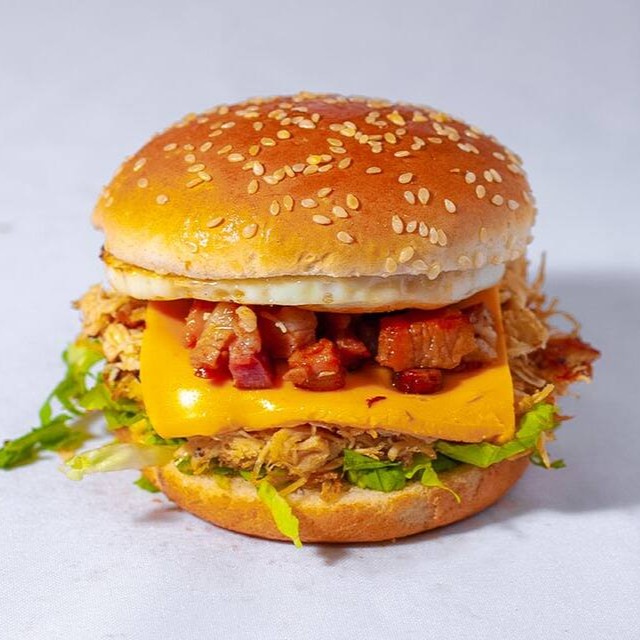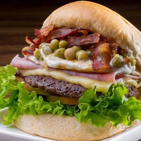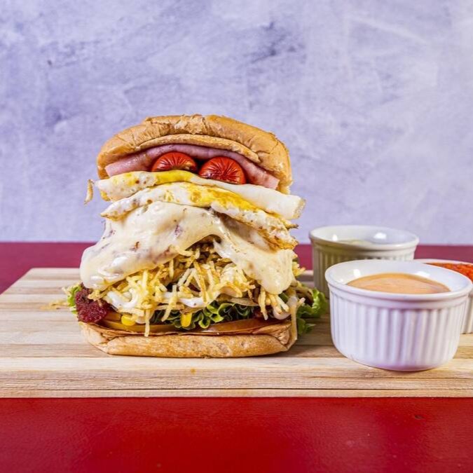 Hamburguer, bacon, presunto, mussarela, ovo, batata palha, alface, tomate, milho, catchup e maionese