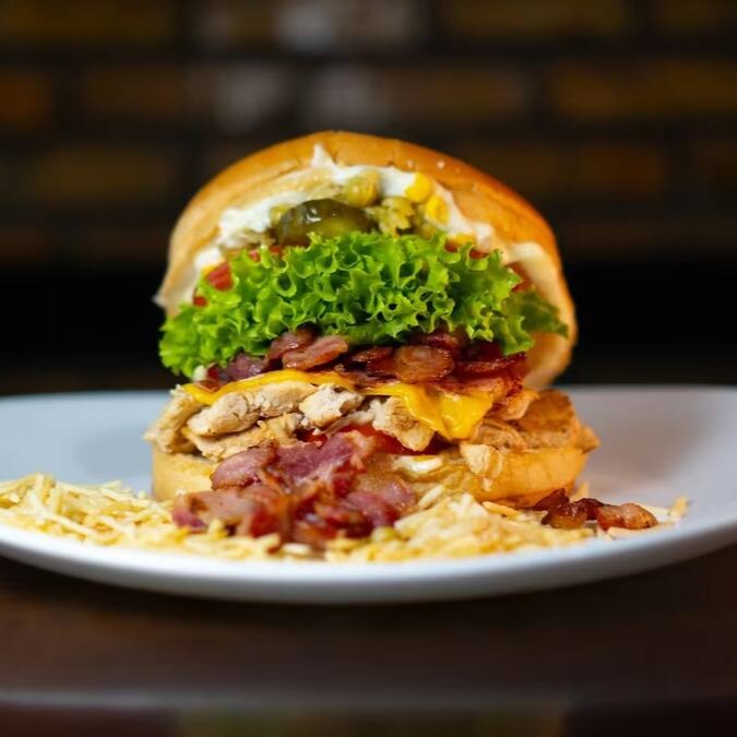 Filé de frango, bacon, ovo, presunto, mussarela, alface, tomate, milho, batata palha, catchup e maionese