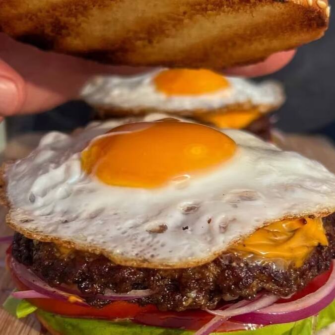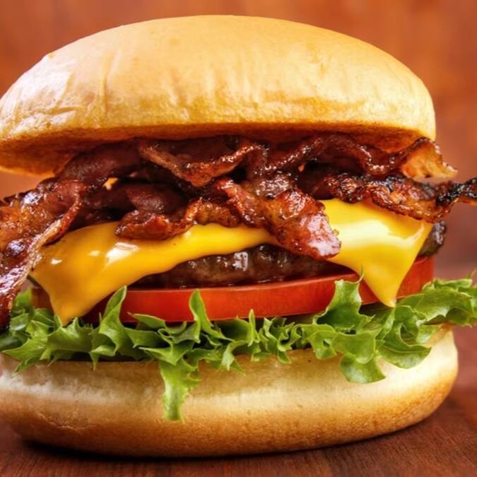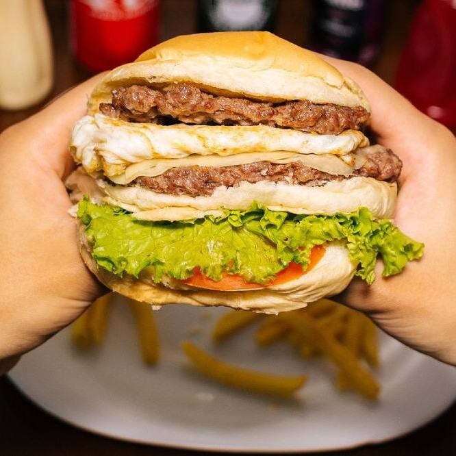 03 Hamburguer, bacon, presunto, mussarela, 2 ovos, cheddar, batata frita, alface, tomate, milho, catchup e maionese
