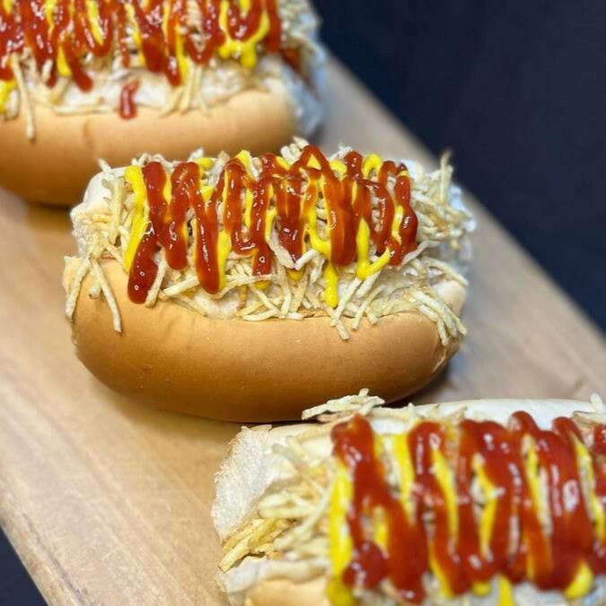 03 Salsichas, bacon, ovo, presunto, mussarela, milho, batata palha, catchup e maionese