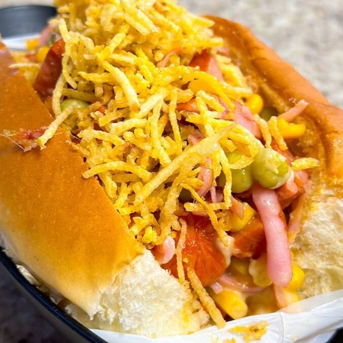 Salsicha, presunto, mussarela, milho, batata palha, catchup e maionese