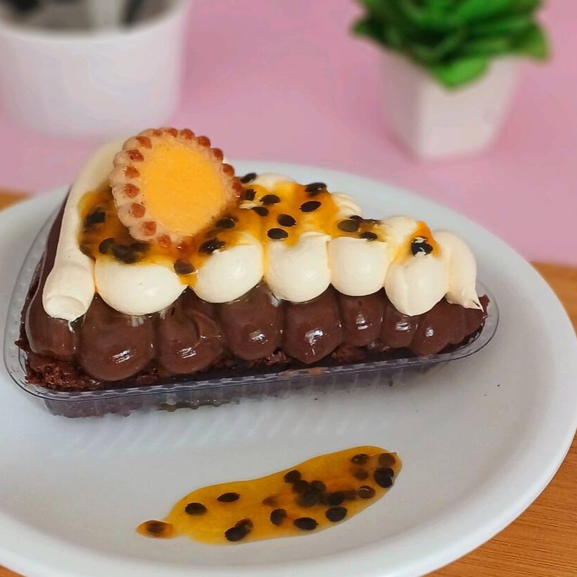 Pizza Brownie com mousse de maracujá ,brigadeiro cremoso e geleia de maracujá uma explosão de sabor .