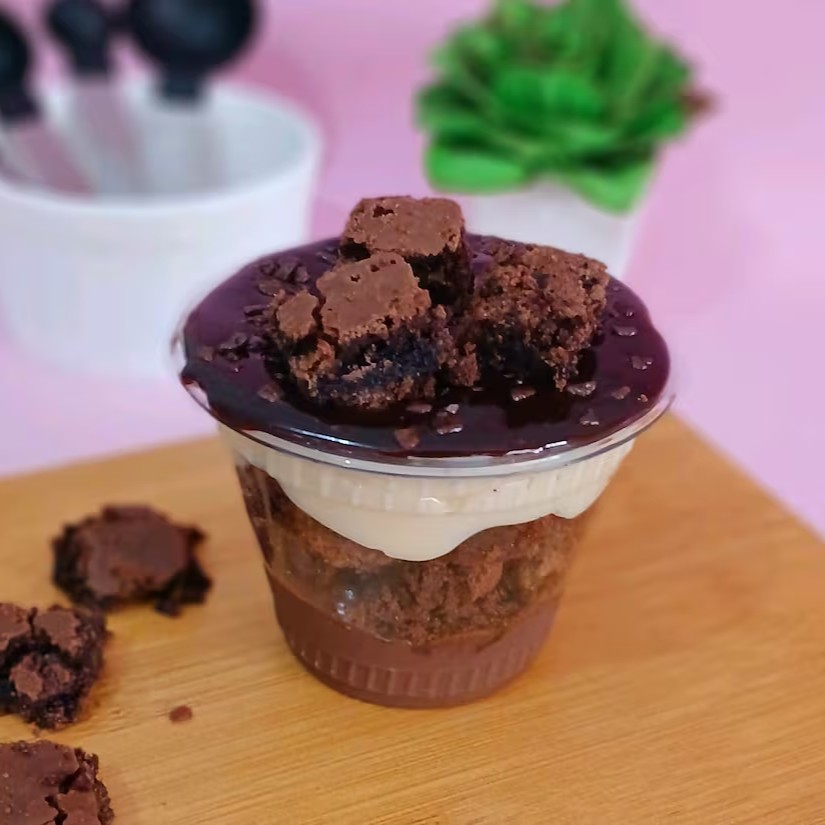 Um bombom super chocolatudo que leva brownie com recheio de brigadeiro e Ninho maravilhoso um copo da felicidade