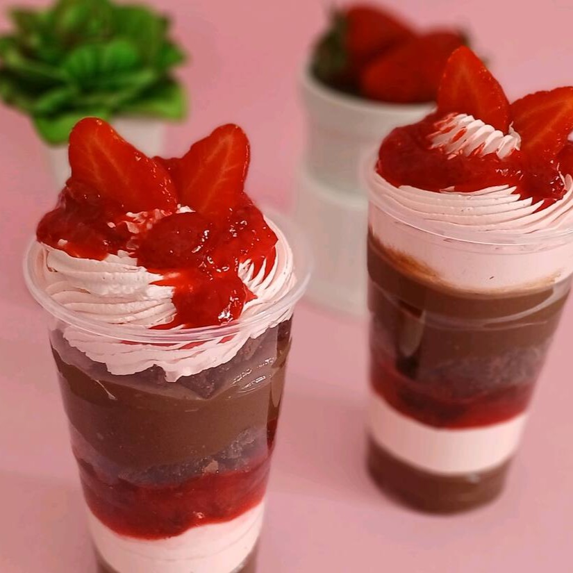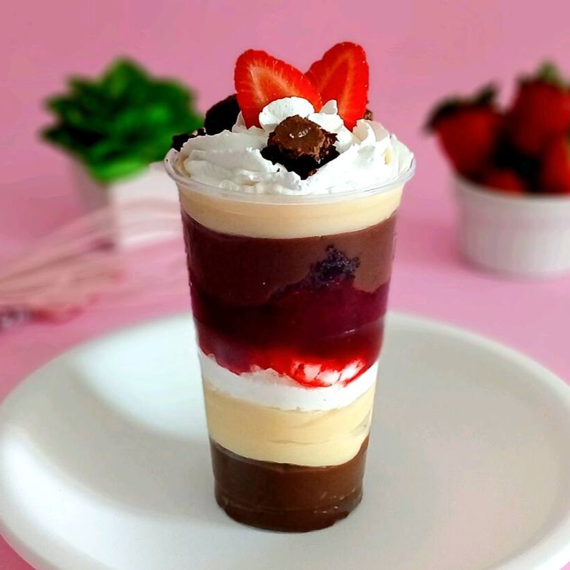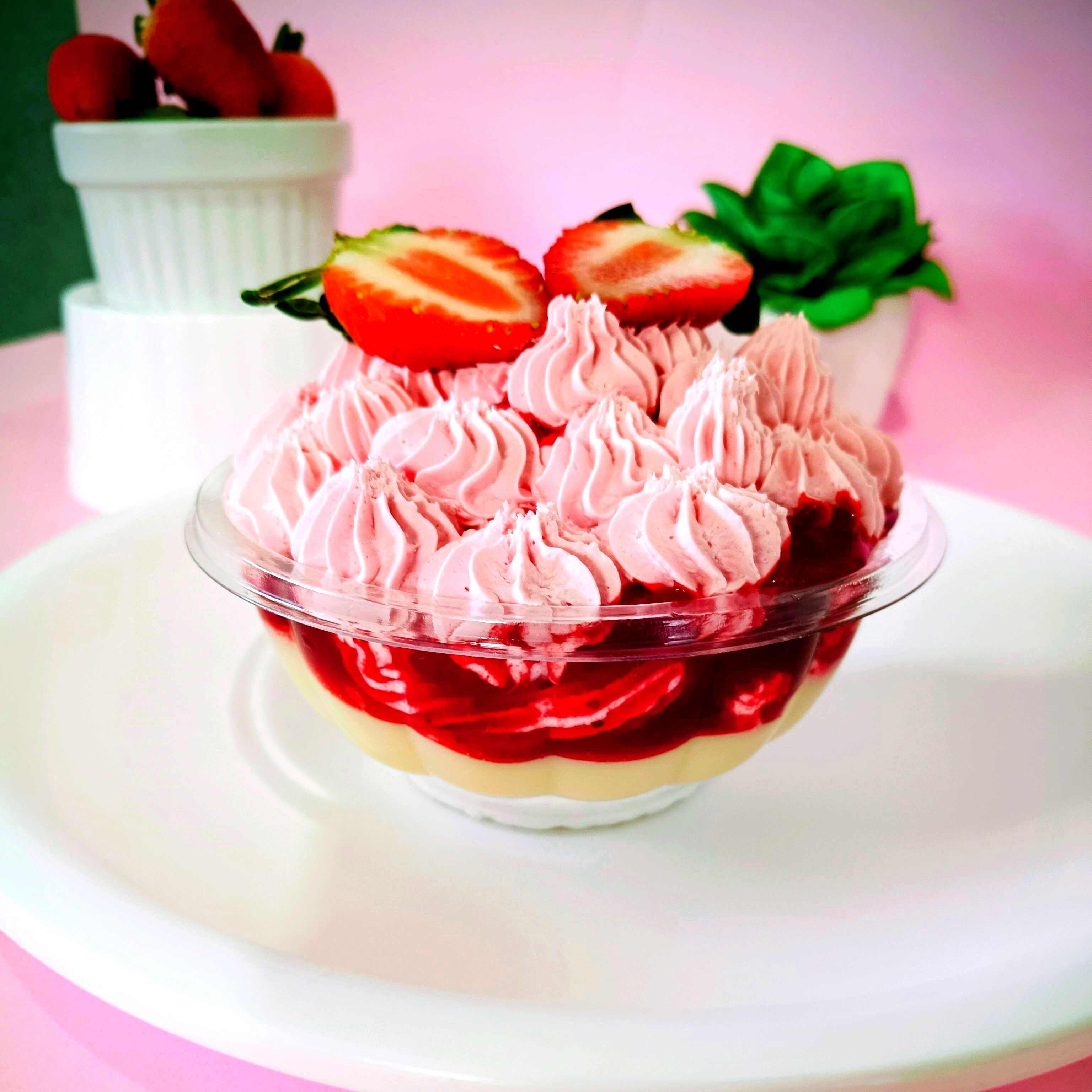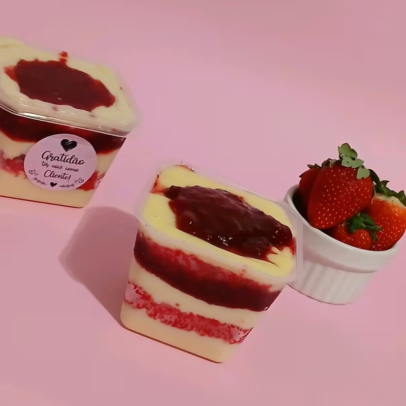 Um bombom de morango feito com uma camada de chantilly, creme branco com geleia de morango e um mousse de morango irresistível super refrescante