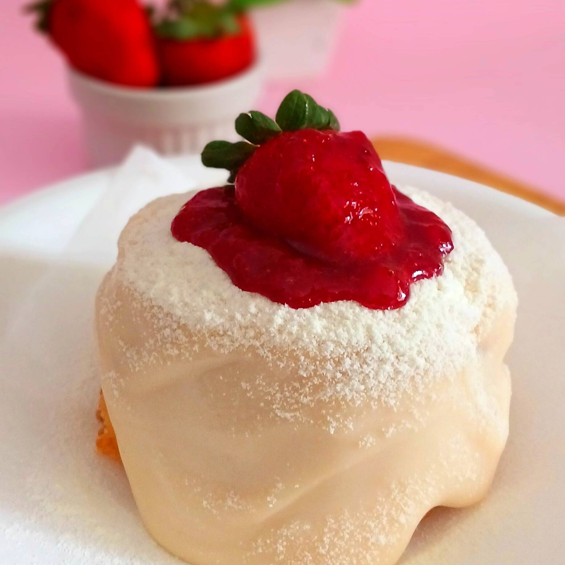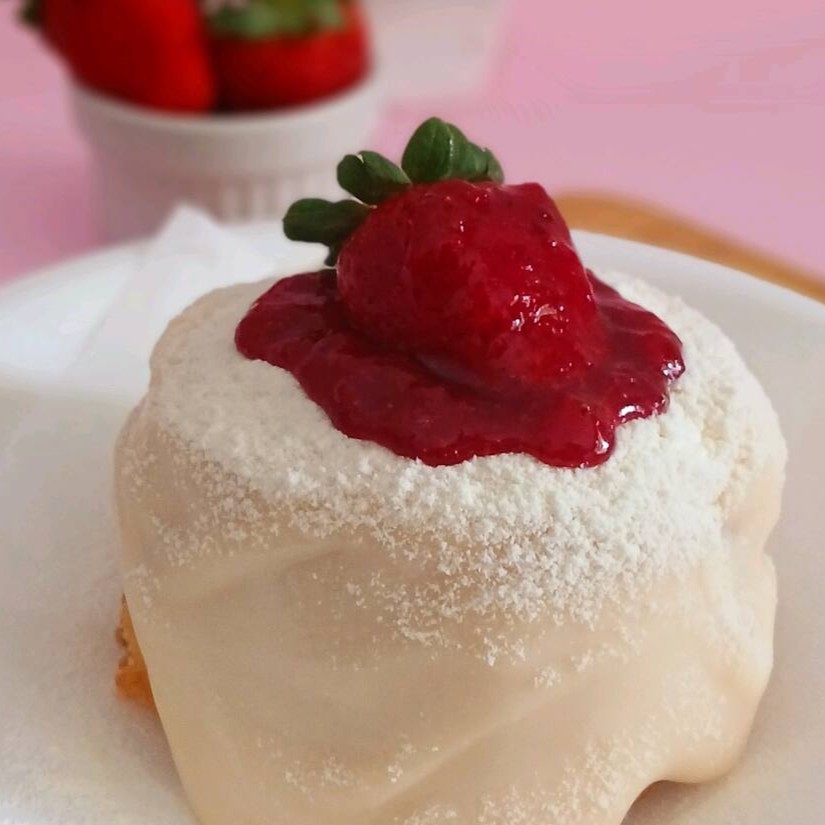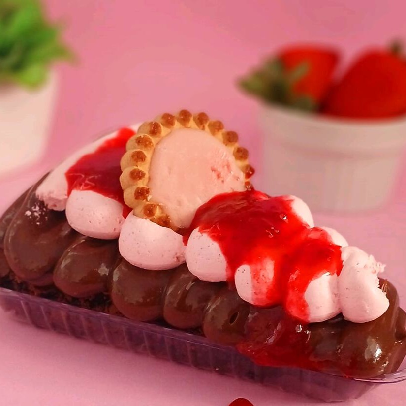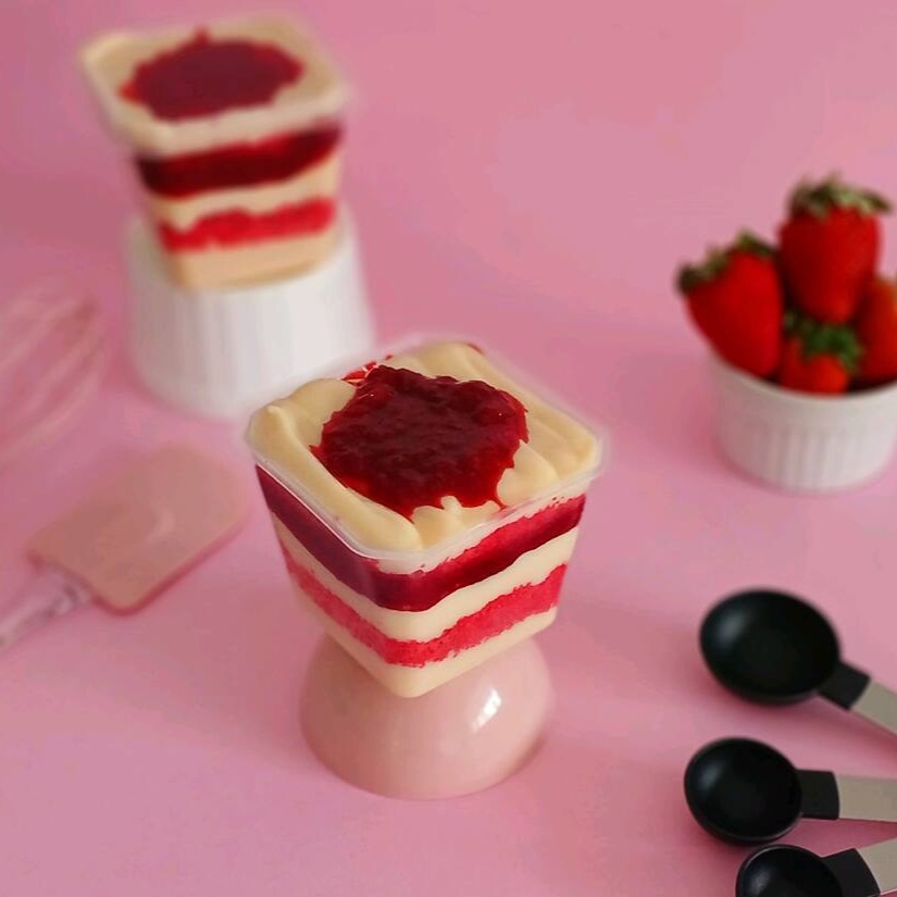 Um bombom de morango feito com uma camada de chantilly, creme branco com geleia de morango e um mousse de morango irresistível super refrescante