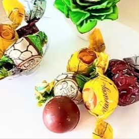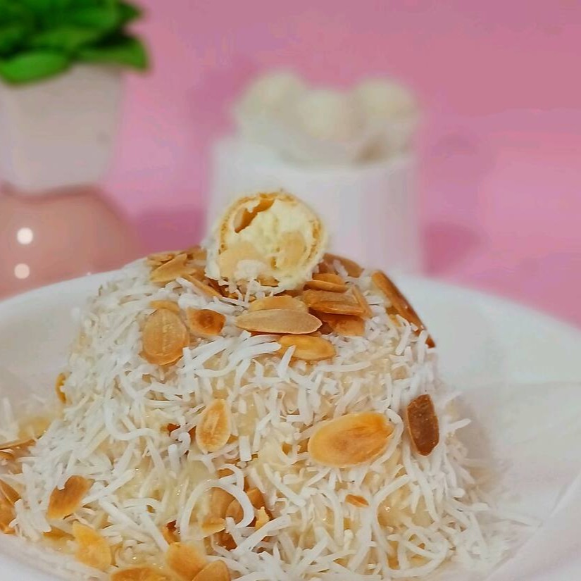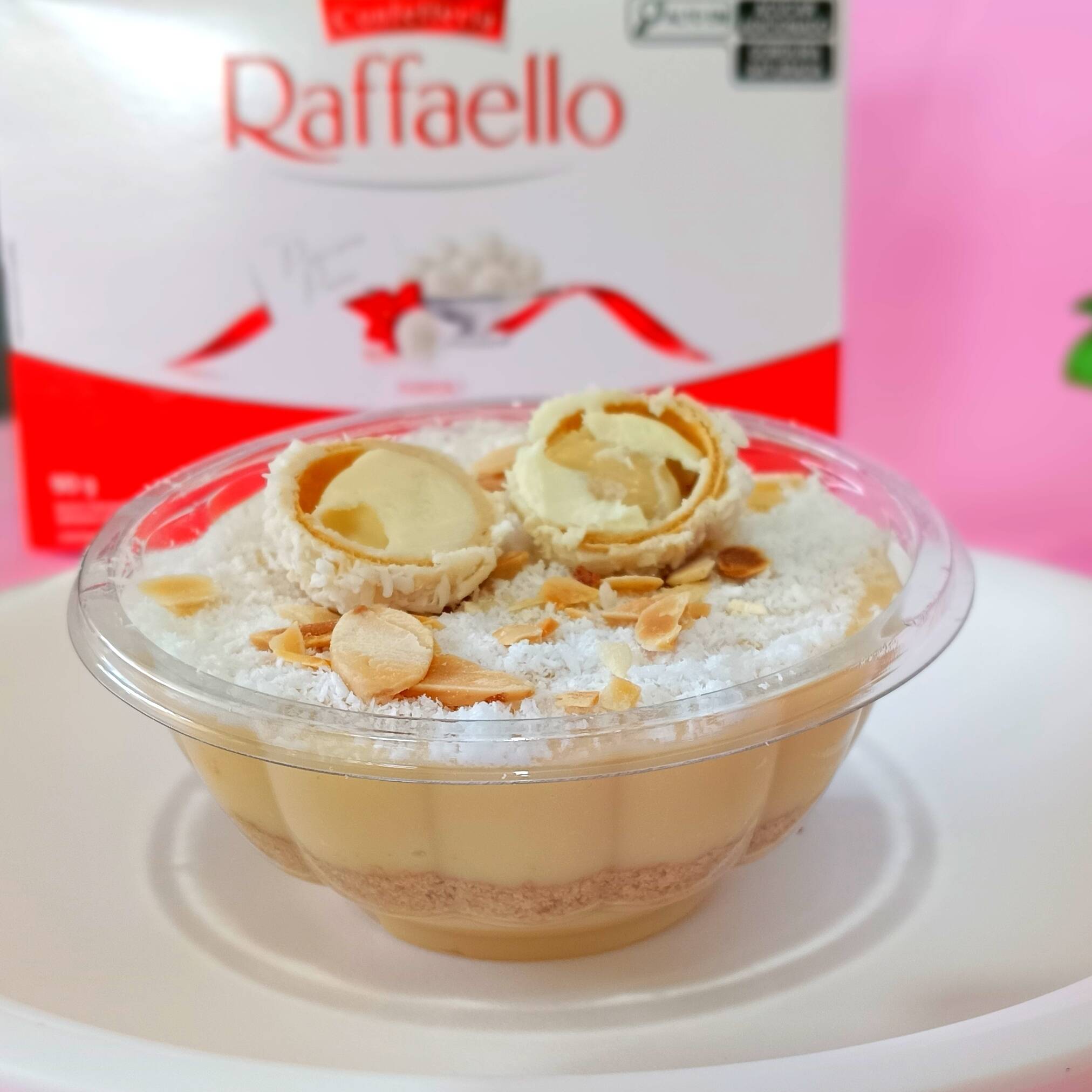 Um bombom com uma camada de creme branco gourmet , camadas de biscoito de maizena com coco úmido ,amêndoas laminadas e o delicioso bombom Rafaello