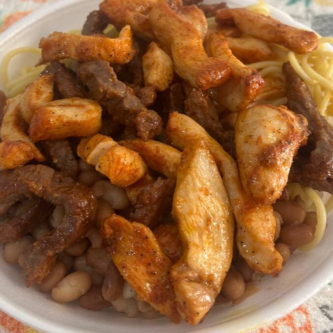 Tiras de alcatra com frango bem temperado, servidos com arroz, feijão, macarrão no alho e óleo. ⭐ Dois sabores • porção reforçada