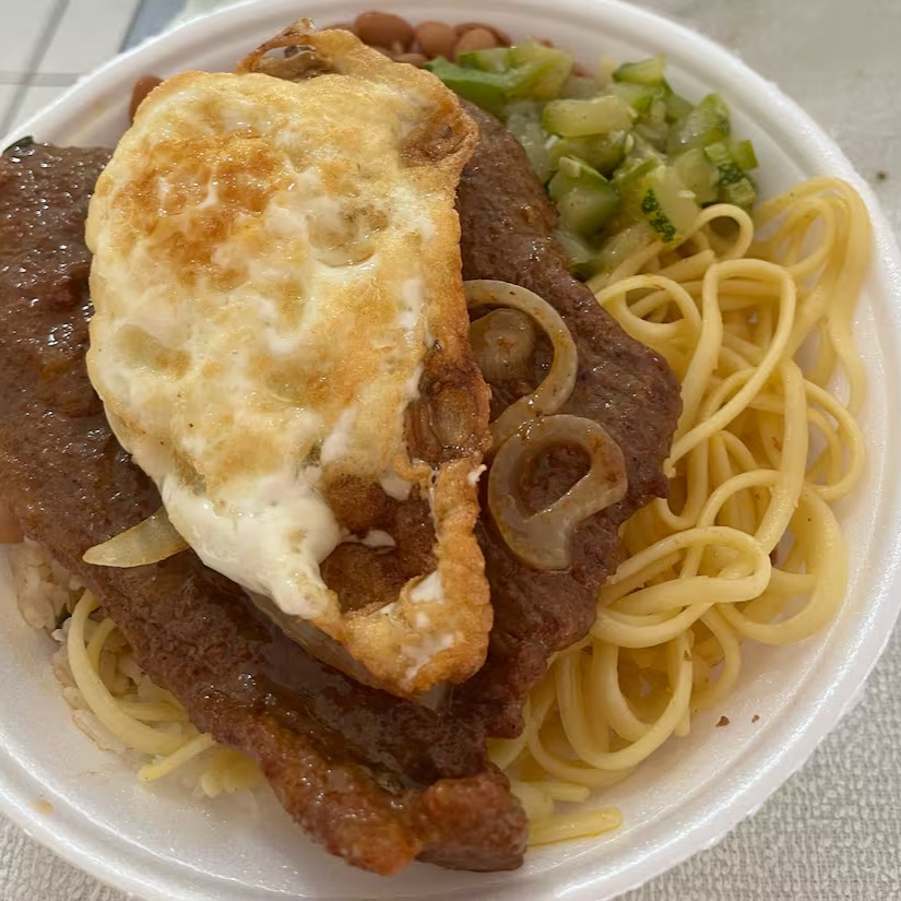 Bife grelhado com ovo frito por cima, acompanhado de arroz, feijão, macarrão no alho e óleo. 💪 Comida raiz • sustância de verdade