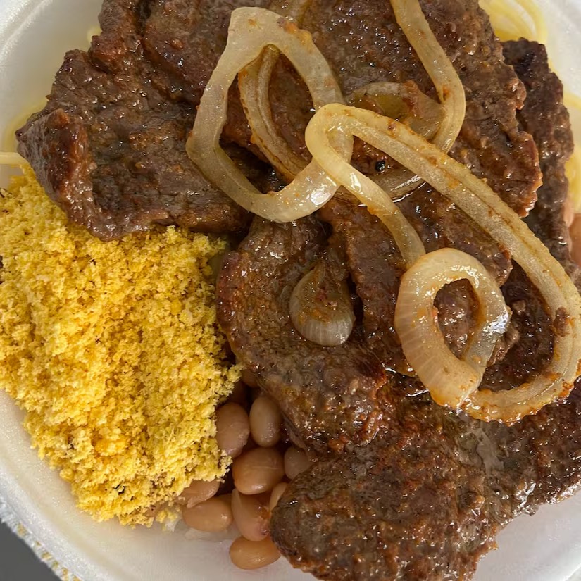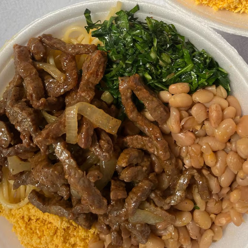 Acompanha: Arroz soltinho, feijao bem temperado, macarrao alho e óleo e farofa. Marmita G bem servida.