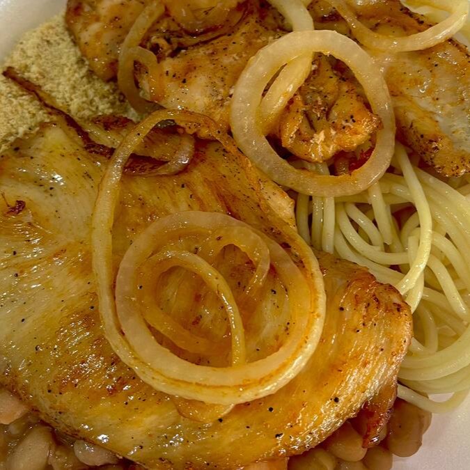 Frango em tiras com cebola dourada e tempero caseiro, servido com arroz, feijão, macarrão no alho e óleo. 💛 Leve • saboroso • completo
