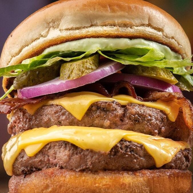 Pão de brioche, 2 hambúrgueres artesanal 160g, queijo prato, bacon, picles, cebola roxa, alface americana e maionese da casa
