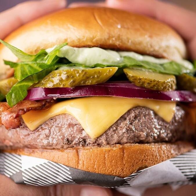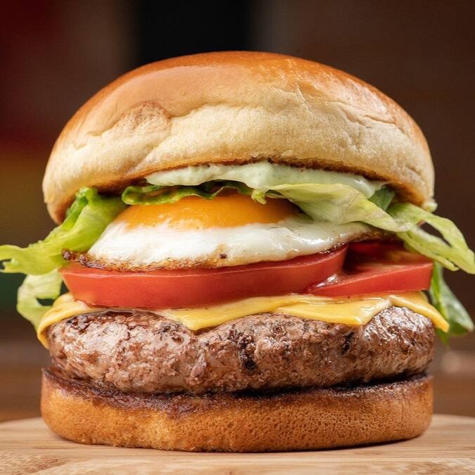 Brioche, hambúrguer160g, queijo prato, ovo, tomate, alface americana e maionese verde.