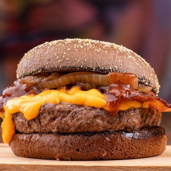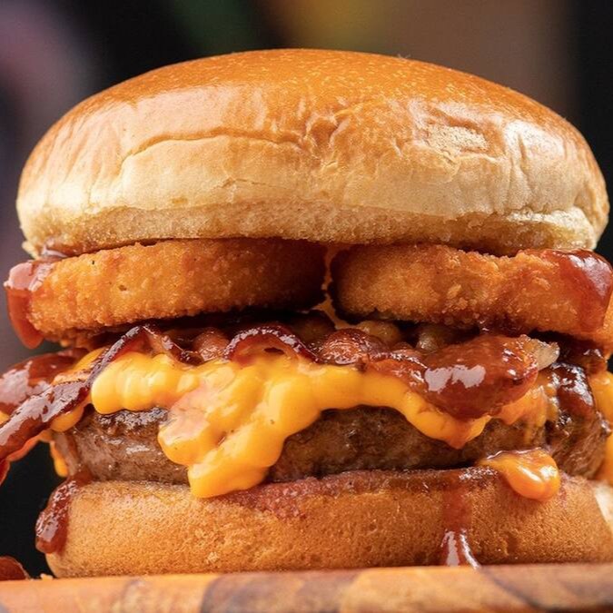 Pão de brioche, hambúrguer 160g, cheddar, bacon, onion rings e barbecue.