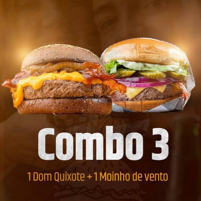 1 Dom Quixote ( Pão Australiano, hamburguer 160g, queijo cheddar, bacon, cebola caramelizada, e bbq de goiabada cascão. + 1 Moinho ( brioche, hambúrguer 160g queijo prato, bacon, picles, cebola roxa, alface americana e maionese da casa). Por favor colocar nas observações o ponto da carne. Caso não conste essa informação, mandaremos ao ponto.