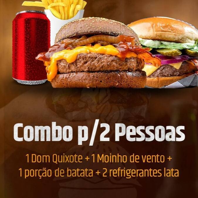 1 Dom quixote (Pão australiano, hamburguer 160g, queijo cheddar, bacon, cebola caramelizada, e bbq de goiabada cascão) + 1 Moinho de vento (Brioche, hamburguer 160g, queijo prato, bacon, picles, cebola roxa, alface americana e maionese da casa) + 1 Porção de Batata frita + 2 Refrigerantes lata (colocar nas observações qual opção). Por favor colocar nas observações o ponto da carne. Caso não conste essa informação, mandaremos ao ponto.
