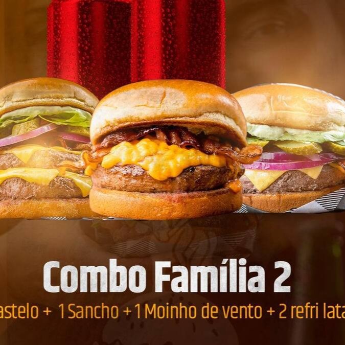 1 Castelo (Brioche, 2 hamburguers 160g cada, queijo prato em dobro, bacon, picles, cebola roxa, alface americana, maionese da casa + 1 Minho de Vento (Brioche, hamburguer 160g cada, queijo prato, bacon, picles, cebola roxa, alface americana, maionese da casa) + 1 Sancho Pança (Brioche, hamburguer 160g, queijo cheddar, bacon) + 2 Refrigerantes lata. Por favor colocar nas observações o ponto da carne. Caso não conste essa informação, mandaremos ao ponto.