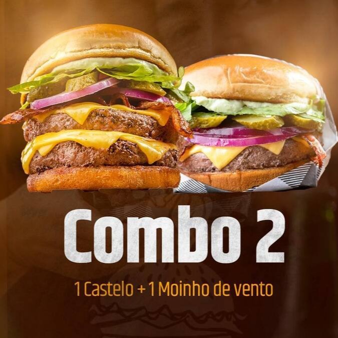 1 Castelo ( Brioche, 2 hambúrgueres 160g cada, queijo prato em dobro, bacon, picles, cebola roxa, alface americana e maionese da casa.) + 1 Moinho de vento ( Brioche, hambúrguer 160g,queijo prato, bacon, picles, cebola roxa, alface americana e maionese da casa). Por favor colocar nas observações o ponto da carne. Caso não conste essa informação, mandaremos ao ponto.